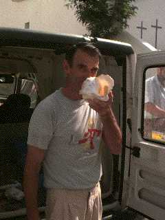 I go back to the things I've left at Fernandito's and continue scribbling on my Newton. A man I don't recognize walks slowly down the sidewalk, sees me, and comes up the stairs into the restaurant. Lurching up to the Round Table, he grabs a chair in the nick of time and collapses into it. He's drunk and reeks of alcohol. After a minute Thomás notices him mumbling and brings the man an espresso laced with sugar, which is quaffed. Leslie calls me from across the street.