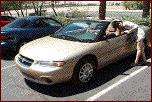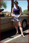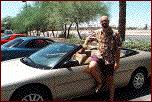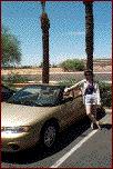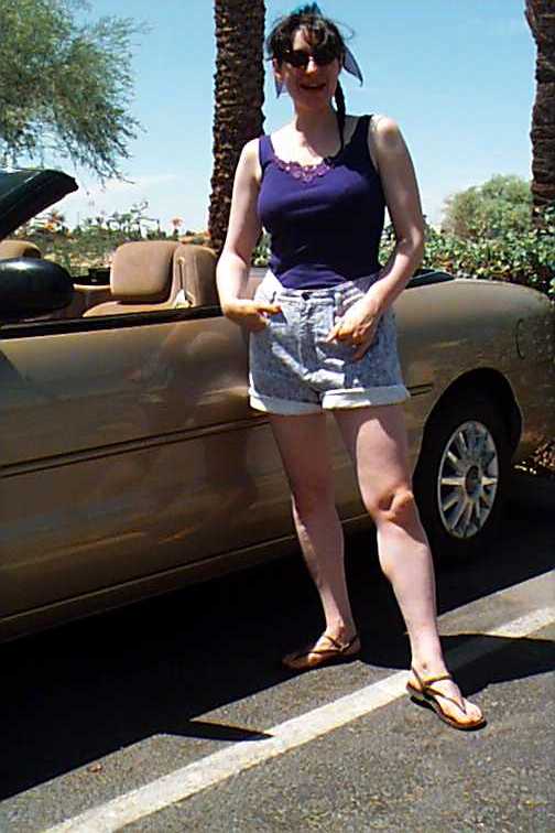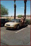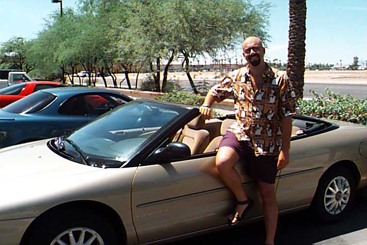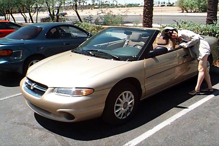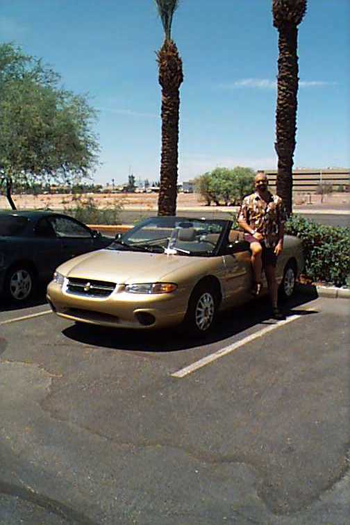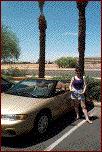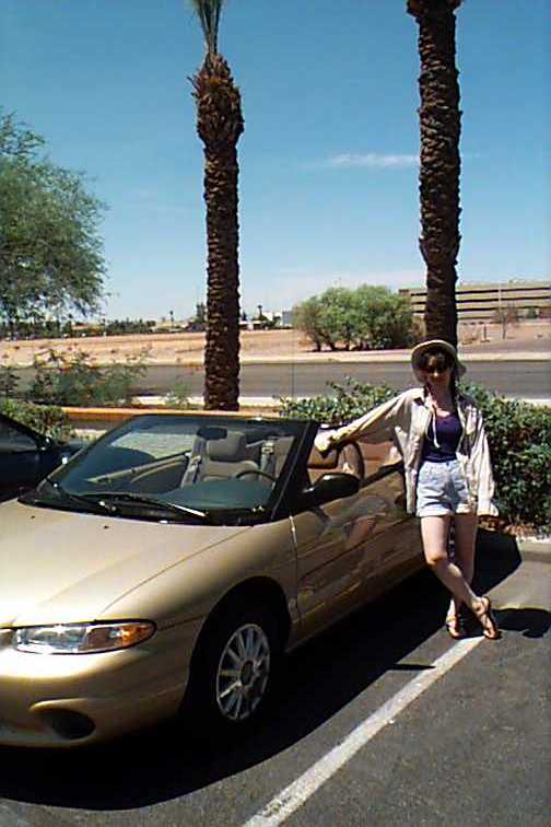 Landing at Phoenix is always fun, what with the invariably hot breezes and cactii. Walking over to the car rental agency, where I meet the same folks I've seen each week for the last quarter or two, I haggle to get a nicer set of wheels than my usual minimalist set. I'm rewarded for being a steady, personable customer: for not a penny more I get a convertable gold Sebring Chevrolet. Rose and I aren't car people, as you can probably tell from the number of photos we took of us next to our chariot.