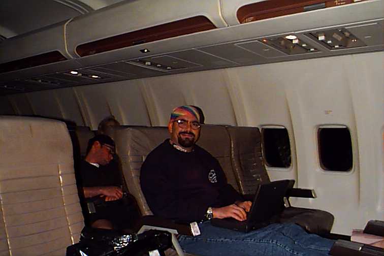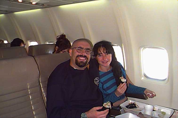 The cab drops us off at the departure gates. We head to our gate, getting one of the early boarding tickets (so that we can sit in one of the three sets of 6-seat face to face areas that are a unique benefit of Southwest Airlines). People don't like to sit facing a stranger, so I can usually put my feet up and have a laptop balanced on, well, my lap. Everything goes as planned, and we're safely ensconced in the comfortable leather seats. If you look carefully you can see that we're eating sushi from styrofoam containers. They're from We Be Sushi; we had the cab stop by on the way to the airport. (See, Andy-san, your sushi at 60,000 feet.)