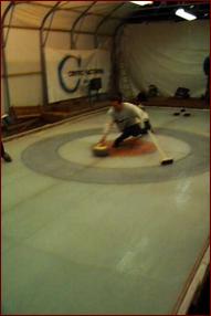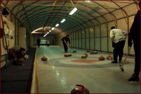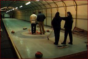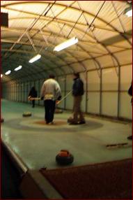 It was a curling practice area. A long strip of astroturf ran the length of the building, parallel to a strip of smooth ice over a pattern of circles and lines.