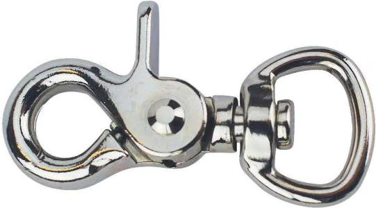 - 1 swivel trigger round eye hook to serve as the connector between leash and harness. My choices were brass or nickle-plated. The swivel is essential to avoiding a tangled leash. This connector gets a lot of use; I opted for a really sturdy one. Swivel eye snap hooks are more common but break quickly and don’t work well with gloves.